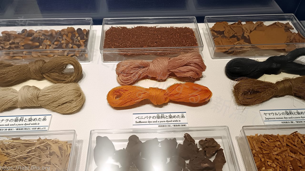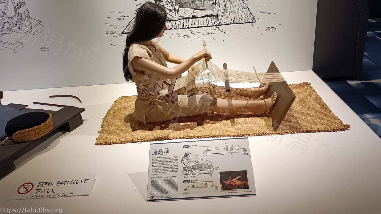 十日町博物館には、火焔型土器だけでなく、古代(縄文・弥生時代)の織物・編み物の展示や織物や編み物の材料になる植物繊維や染料・縄文時代の編み機なんかも展示されている。