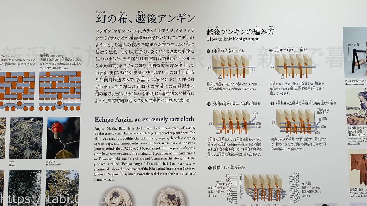 アンギン技法と製品が実用品として明治時代まで作られ、使われたことが確実視されているのは信濃川流域の新潟県妻有(つまり)地方、21世紀現在の中魚沼郡津南町や十日町市である。(中略)この地域のアンギンは、経糸に丈夫さを求め、緯糸は布の柔軟性を生み出す工夫がされ、緯糸にはイラクサやアオソの繊維が用いられていた。https://ja.wikipedia.org/wiki/%E7%B7%A8%E5%B8%83